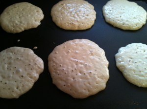 Throw some batter on the griddle in pancake size shapes. Wait till the edges have started to firm up a bit – then carefully flip ’em and let ’em cook for a minute or so.